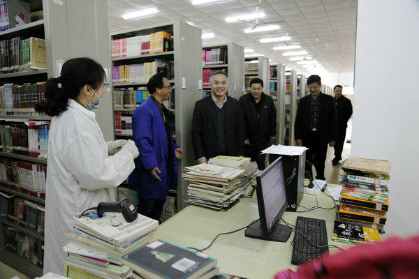 本站讯 1月6日上午,校党委副书记、校长曾晓春,校党委副书记胡国瑞、校党委委员、副校长邱家明和校党委委员、宣传部长杨健在图书馆馆长袁海波的陪同下,到图书馆亲切看望了在各书库为剔旧整理辛苦工作的馆员们。