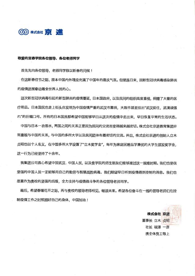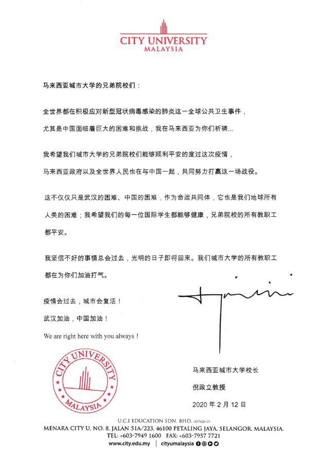 同样牵挂beat365的还有日本京进会社的立木贞昭董事长和马拉西亚城市大学倪政立教授,分别发来慰问信,关心中国疫情防控工作,慰问beat365疫情防控教师,和广大同学。