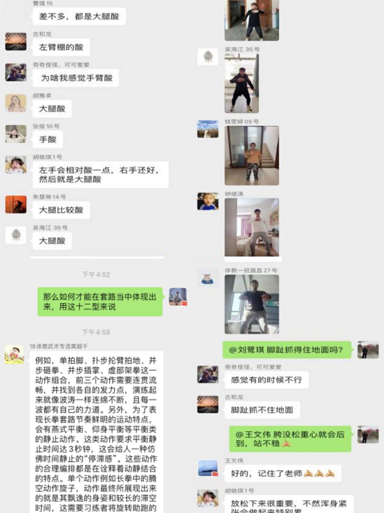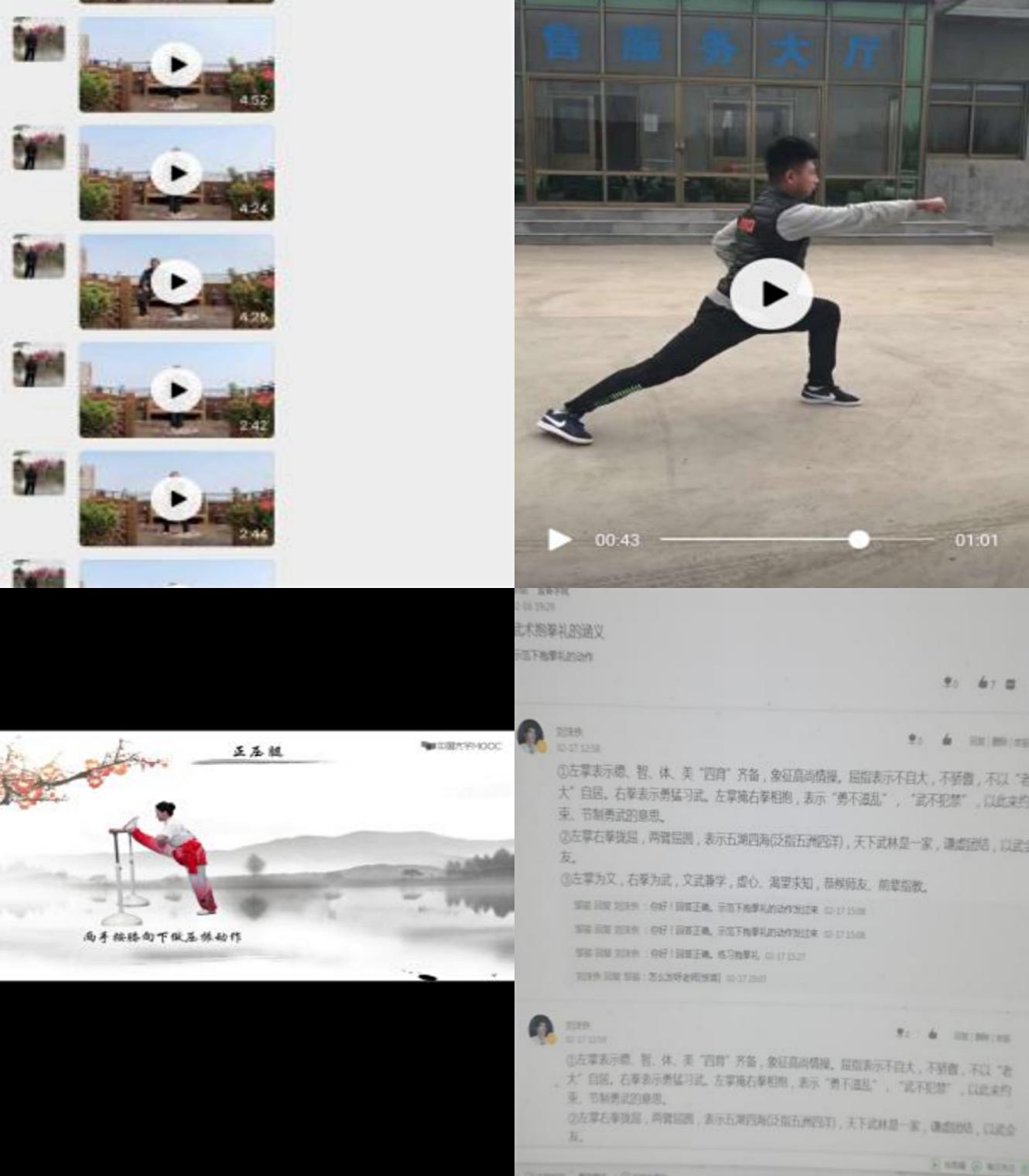 为克服疫情带来的各种困难,自学校下达开展线上教学的通知起,体育学院武术教学团队第一时间建立了团队微信网课工作群,制定多种方案并进保证课堂“不掉线”,每天以视频交流进行网课教研活动,研讨如何上好线上课,并自我加压挖潜,整合内外教学资源,制作以团队老师主讲的校本教学视频30余个,满足本学期武术技术课教学需求,使网课真正落地实处。在实际教学中,教师以教学质量和教学效果为中心,根据实际情况灵活运用学习通、微信等多个网络平台进行考勤、授课、互动、作业布置和疫情防控宣传等,充分确保了课堂教学质量和教学效果。一些教师还发挥网络平台的视频直播功能,用直播的方式给学生进行动作指导,并实时查看和纠正学生的技术动作,让专项课也能在线上“活起来”。