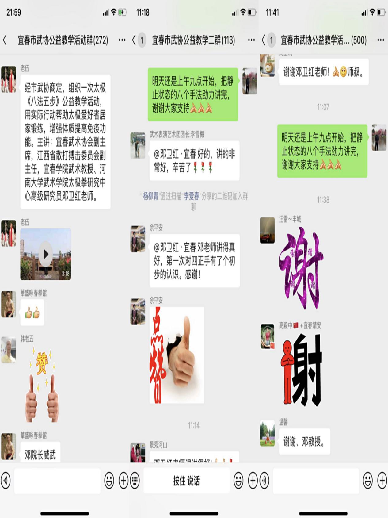 课后,团队教师们及时搜集学生反馈信息,并在教研室和学院教师群中积极分享经验、交流意见以确保后续教学更加顺利进行。并且为了加强疫情防控知识、健康理念和传染病防控知识的宣传教育,提高学生的科学防控、自我保护水平,教学团队在教学中合理加入疫情防控知识,提高科学防控意识。除此之外,团队还积极运用专业知识为社会疫情防控工作服务与宜春市武术协会联合开展线上太极拳公益教学活动,指导市民居家锻炼,规范太极拳技术动作,提高免疫力。