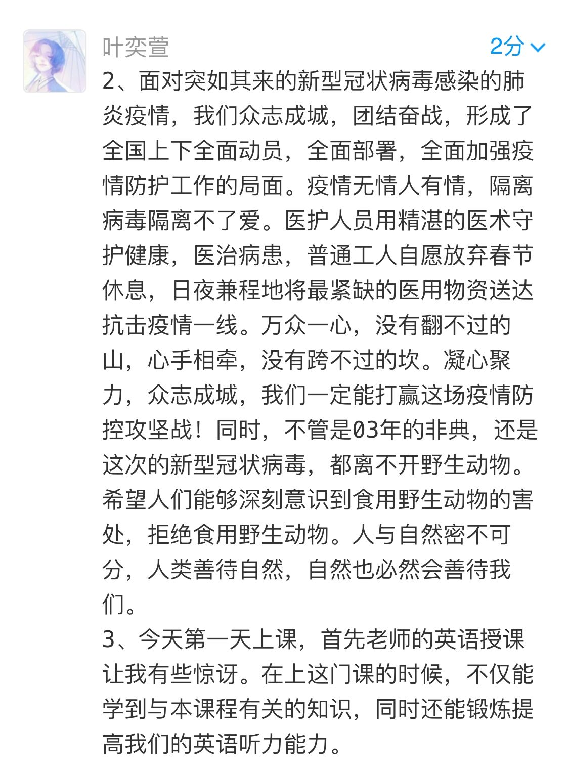 在抗击新冠肺炎疫情的特殊时期,徐老师除了做好双语教学,还身体力行地结合全国上下齐心协力抗击新冠肺炎的鲜活事例来对青年学子进行生动的思政课教学。她用手中的笔向最美逆行者们致敬。她的原创诗歌朗诵作品《巾帼逆行撑起半边天》在“学习强国”“人民日报新媒体平台”“今日头条”“百度视频”等媒体和“江西工人”“宜春文艺”“宜春女性”等微信公众号上刊登,她创作的诗歌《静中行》发表在《江西新闻》《宜春日报》《宜春数字报》上,充分彰显了beat365思政课教师的爱国情怀。她用自己的实际行动为抗击疫情贡献力量,也用自己的真情实感深刻影响了学生。18级英师1班的朱艺同学说:“看了视频后很感人,我们要致敬在一线的逆行者们,我们也要响应党和国家号召,在线认真听课,好好学习”。