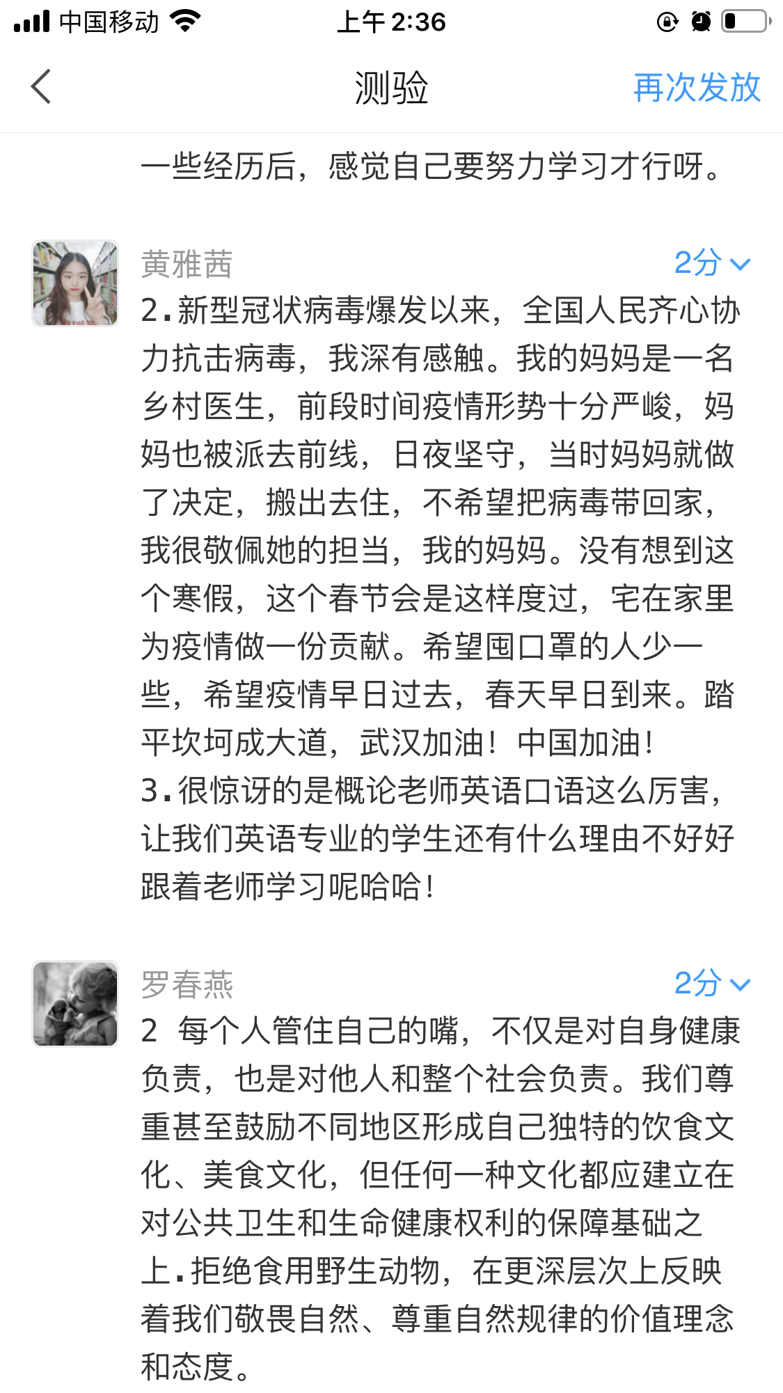 徐天兰博士授课的班级是18级英语师范班、翻译班、商务英语班、法语班。疫情期间,她在利用超星学习通平台的教学资源以及平台中问卷、抢答、投票、直播等功能开展互动授课的同时,积极探索双语教学。尽管在常规备课之外还要额外花时间摸索,但是徐老师仍努力创新,尽力做到用最合适的双语教学方式来取得更好的教学效果。根据统一安排,本学期的第一堂思政课是抗击新冠肺炎专题,徐老师采用了全英文讲授。刚开始上课的时候,有学生没有反应过来还以为是在上英语专业课。18英师(2)班的余康同学在学习通平台留言说:“第一次全英文上概论课真是有趣。”在接下来在线教学中,徐老师与同学们积极沟通,利用学习通APP进行问卷调查,更加清晰地了解同学们的真实想法,教与学渐渐默契。考虑到有些专业术语难于一听即懂,徐老师就用中文进行更加深入的讲解。18商务英语(1)班的叶奕萱同学说:“老师的英语授课让我有些惊讶,既学到了思政课有关知识,同时还提高了我们的英语听力和口语能力” 。