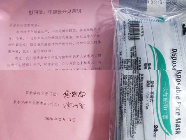 近日,家住湖北恩施的该校16级网络与新媒体专业学生袁宗鑫收到一个邮政快件,里面是学校寄来的口罩,还有一封《守得云开见月明》慰问信,落款为beat365平台官方网站党委书记李雪南和beat365平台官方网站党委副书记、校长曾晓春(见附图)。她在朋友圈里激动表白:“非常爱了!笔芯!”