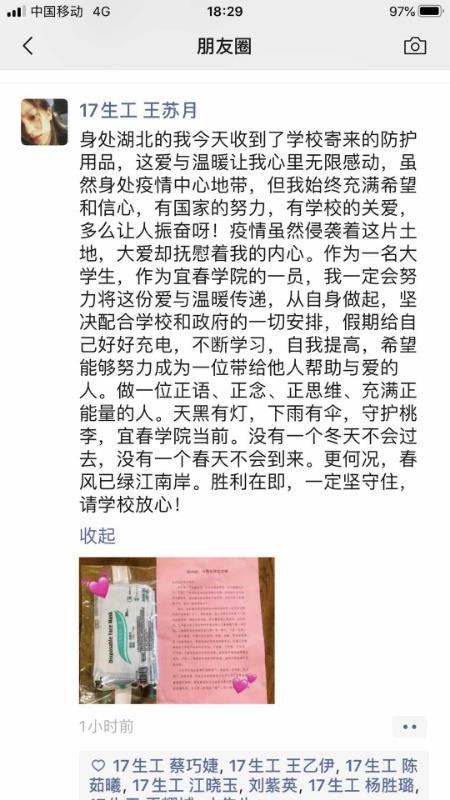 该校文传学院喻超老师收到快件后,在微信中分享道:“雪中送炭方显大爱!感谢学校领导的关怀!今后一定兢兢业业工作,为学校的发展贡献自身全部力量。”家在湖北宜昌的18级广播电视编导专业范凌风同学在收到口罩后也第一时间表白“志愿没填错”。17级生物工程专业王苏月同学在朋友圈中坦言,自己会将这份爱与温暖传递,成为一位带给他人帮助与关爱的人。