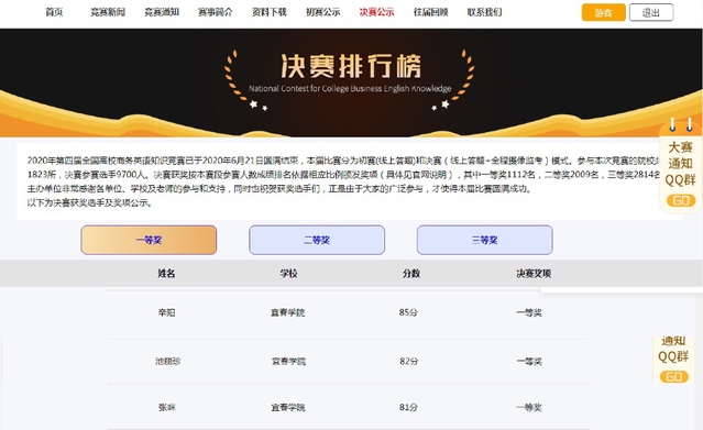 本站讯(特约通讯员 卢怡)近日,2020年第四届全国高校商务英语知识竞赛圆满结束。beat365外国语学院共组织142人通过线上报名参加了该项比赛,最终15名同学在决赛中荣获嘉奖,其中18商务英语1班辛阳同学,17英语师范3班池丽珍同学,16商务英语2班张咪同学3位同学获得一等奖,为学校赢得了荣誉。