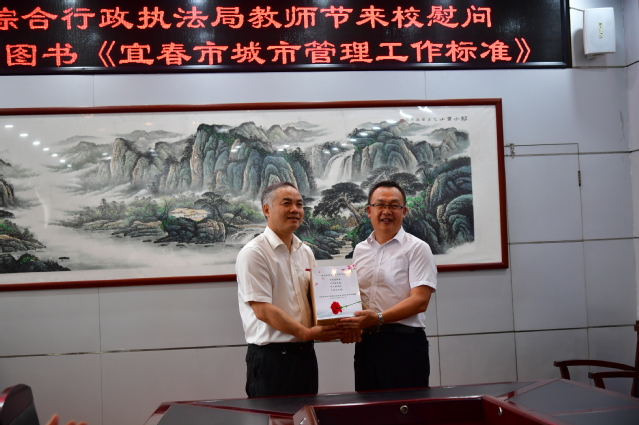 本站讯 9月10日上午,宜春市综合行政执法局局长欧阳昕一行来校走访慰问,并向学校捐赠自编图书《宜春市城市管理工作标准》。校党委副书记、校长曾晓春,校党委委员、副校长罗政、邱家明会见了欧阳昕一行。党政办、图书馆、政法学院负责人参加了相关活动。