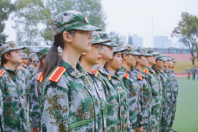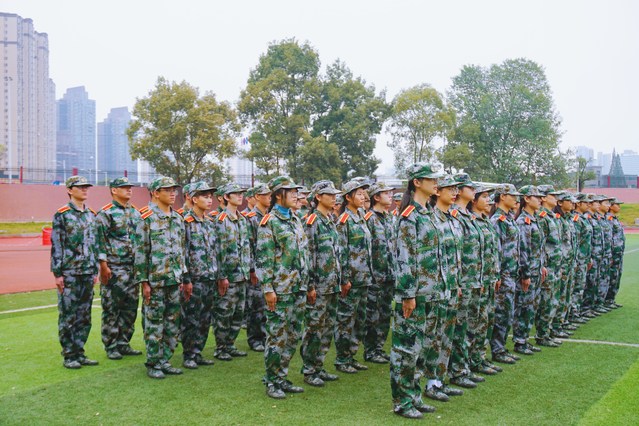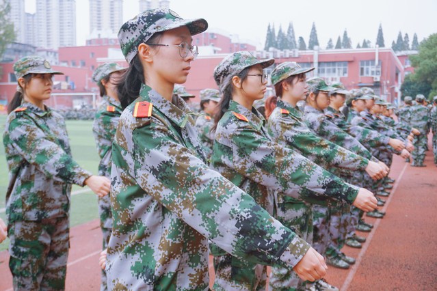 一声“立正”,一群身着迷彩服的新生们,迅速站好队形,形成一个整齐统一的矩阵;“向右看齐”,新生们齐刷刷地向右看齐;“稍息”,新生们伸出右脚;“全体都有,踏步走,幺二幺……”,他们眼神坚定,步伐一致,脚声整齐响亮;“立定”,他们立刻调整步伐,齐齐停下。看着行云流水般的动作真是令人舒畅,连连赞叹。