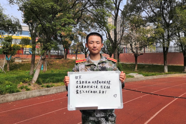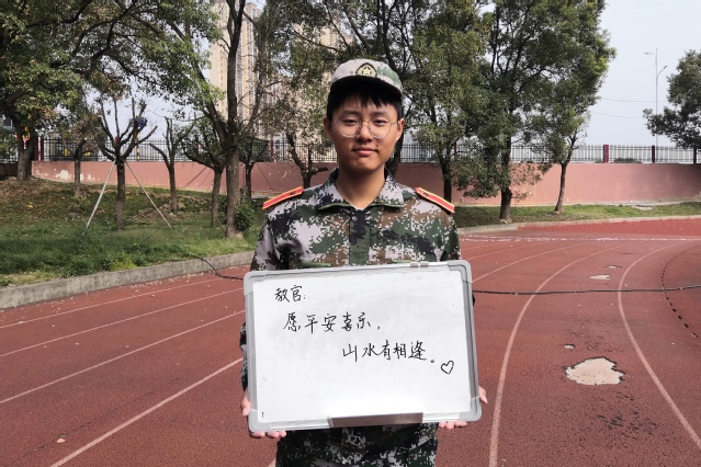 “咱们都是南昌人,有几次听到你口中的南昌话都感到非常亲切,虽然才在你的手下军训几天,但是你还是让我存在感满满啊。从踢正步定型在我脚上放块砖,再到后来的全排面前的独唱。这些基本上让全排都记住我了。军训快结束了,可能以后我们都很少再遇见,但是在这里我想再和你说最后一句话:谢谢你的陪伴让我度过了一个充实的军训,让我有一个美好的回忆。”20级国际经济与贸易1班丁奕溥如是说到。