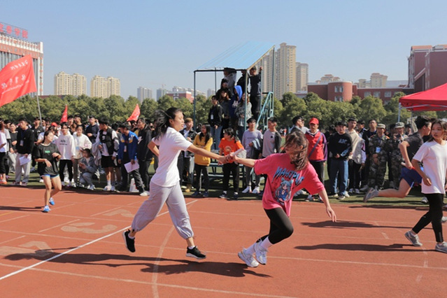 接力比赛紧张进行着。比赛时,各组选手手持接力棒,等待那一声“冲锋号角”,枪声响起,选手们团结一心、奋勇拼搏。“真的很累,特别是最后一百米的时候,但是我不能辜负队友的信任,我有着自己的使命。这是一场团体赛,我要做好自己的这一次交接!”来自数计学院20计外一班的徐佳敏说道。接过手中的接力棒,沉甸甸的使命降落肩头,看那飞驰的身影,奔赴的是一场永不退缩的约定。