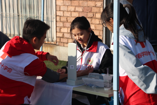 红十字马甲、红绣圈是他们的标配,晨光熹微,他们便到达田径场上的临时医疗点,井然有序地悬挂会旗、检查药品,并贴心地为同学们准备好物资,以充分为本届校运会保驾护航。他们站在印刻着“十”字的会旗下静静地看着急救手册,笔者走进红十字协会的大本营里,看到了正在接受现场培训的红十的成员认真地听着队长所讲述的内容。笔者听到了这样一个词,叫做“博爱精神”,在偌大的田径场,在诸多的赛事中,总是会有一些突发的卫生安全事件,红十字协会作为一支接受过专业培训的组织,有责任和义务在第一时间给予伤者全面、系统的治疗与诊断。