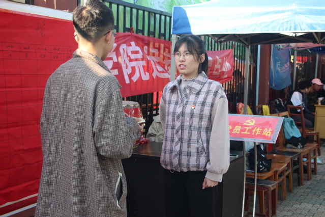 远远看过去,红黄颜色搭配的党徽图案映入笔者眼帘。一路走来,笔者看到了各个教学院的学生党员工作站错落在校运赛场的周围。校运期间,各教学院学生党支部积极发挥着基层支部的主观能动作用,号召学生党员们走进田径场,走近校运会,为校运赛场的秩序维护贡献一份自己的力量。就笔者了解,在校运期间,偶尔会出现一些突发情况,比如运动员由于透支体力晕厥,党员工作站的同学们便会挺身而出,把受伤的同学搀扶到指定的休息医疗点。“选择了入党,就要为身边的同学做力所能及的事,服务身边的同学,以实际行动向党组织靠拢,运动会期间,我们都会扎根在校运会的赛场上,只要有需要,我们就一定在。”党员工作站的程梦琴同学说话时眼神格外的坚定,在她的眼中,像是有运动健儿们在赛场上悦动的身影,亦仿佛有一面鲜红的党旗在高高飘扬。