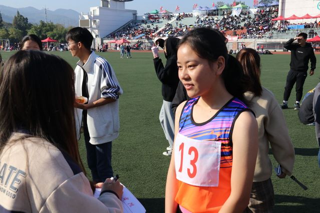 今年是第三次参加运动会,心情同前两次相比仍旧是紧张的。廖矿矿笑着说:“前两天体测跑个800米,心都紧张的咚咚跳。”对于这次运动会,廖矿矿已不再纠结名次的得失,只希望自己可以在时间上进一步突破自我。她说现在自己进入了瓶颈期,希望有一个刺激可以帮助自己完成突破。被问及有没有什么竞争对手时,理工学院一名同为定向越野队的选手是廖矿矿极为重视,他们在定向越野队中互相鼓励,遇到困难时彼此打气加油,在赛场上互相追赶,亦敌亦友,共同进步。