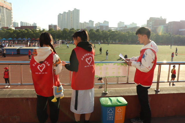 环保协会的会长李淑健说到“运动会期间会必定产生许多的垃圾,我们在看台上设立垃圾桶,同时也有干事在旁边的走道上督促同学们将手中的垃圾丢到垃圾桶中。正值运动会期间,我们环保协会更应该向大家宣传环保的理念,这是我们环保协会的职责所在。”让环保的风吹入运动场,让大学生环保理念的践行者和传播者。“我们希望这次活动并不只是停留在表面,而是真正可以留下些什么,让它变得更有意义”。运动员们在跑道上奔跑,在沙坑处跳跃,在圆圈处投掷,展现自我,大放光彩,而环保协会的成员们在看台处督巡,为运动会增添光彩。