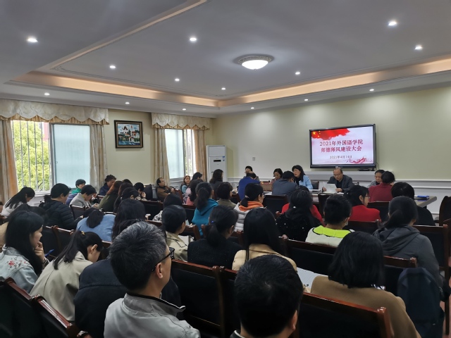 本站讯(外国语学院 供稿)4月14日下午,外国语学院在人文楼S208会议室召开2021年师德师风建设大会,院领导班子成员和全体教职工参加会议,会议由该院党委书记伍忠主持。