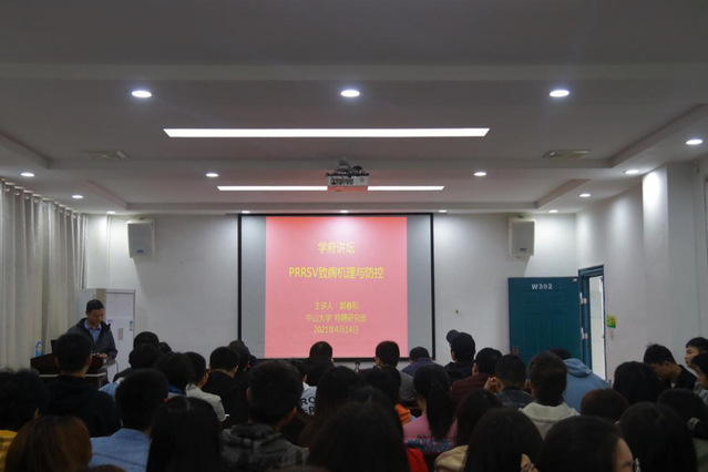 讲坛开始,郭春和就个人简历、学术成绩、拟开展的研究工作三部分内容进行阐述。随后,郭春和讲述了当前项目研究背景,并对PRRSV病毒进行了详细介绍。通过统计和研究国内外疫苗,指出疫苗效果不理想的现状和问题,并提到解决途径在于培养抗病猪和开发抗病毒药物。紧接着,郭春和讲到主要研究内容的创新点及科学意义,同时向同学们强调到在科研道路上要有坚韧的意志力和不怕困难的冲劲,要有迎难而上的态度。