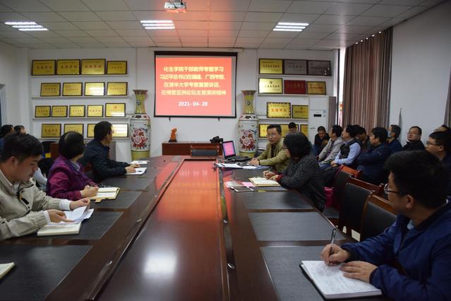 本站讯(学生通讯员罗晓颖刘丹)4月28日下午,化学与生物工程学院召开干部教师政治学习会,专题学习了习近平总书记在福建、广西和清华大学考察期间重要讲话以及在博鳌亚洲论坛2021年年会开幕式上视频主旨演讲精神。该院院长郭孟萍、院党委书记黄良辉、副院长张文彬、院党委副书记陶华蕾以及全院教职工参加会议,学习会由黄良辉主持。