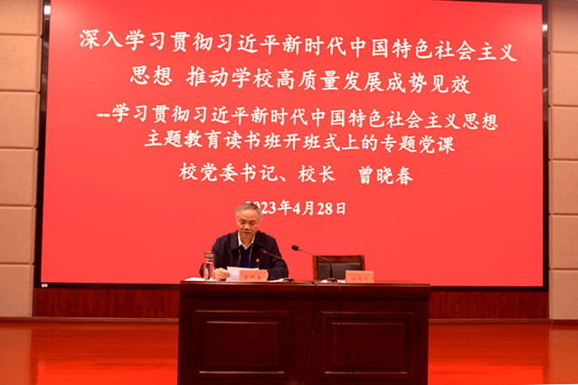 随后,曾晓春以《深入学习贯彻习近平新时代中国特色社会主义思想 推动学校高质量发展成势见效》为题讲授专题党课。他就以下三个方面进行了深入阐释:一要深刻领悟习近平新时代中国特色社会主义思想的核心要义和主要内容;二要准确把握习近平总书记关于教育、科技、人才重要论述的内涵;三要以学铸魂、以学增智、以学正风、以学促干,推动学校高质量发展。