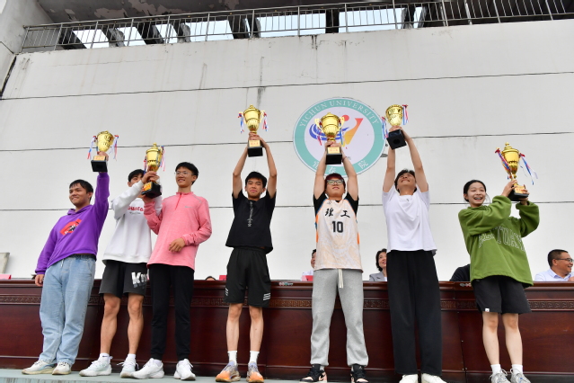 本届校运会总裁判长兰青宣布了运动会团体成绩及其他获奖名单。随后,与会领导为获奖单位和个人进行了颁奖。