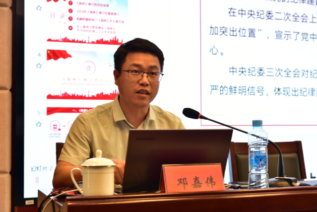学习会上,宜春市纪委市监委案件审理室四级主任科员邓嘉伟围绕“以严明的纪律推进党的自我革命”这一主题,从“《条例》修订的历史沿革”“《条例》修订的重要意义”“准确把握新修订《条例》的主要内容”“在认真学习贯彻落实《条例》严守党的纪律上下功夫求实效”四个方面,以深入浅出的语言和典型深刻的案例对新修订《中国共产党纪律处分条例》精神进行了解读。
