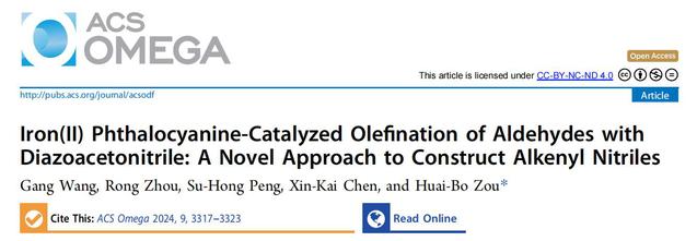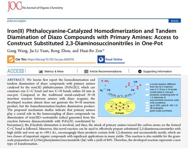 传统意义上,金属催化下重氮试剂与胺之间的反应主要集中在或局限于N-H键插入,生成N-H键插入产物;而王刚同学研究发现在酞菁铁(II)催化下重氮乙腈与胺之间的反应则另辟蹊径,发生了自二聚-串联二胺化,生成的是2,3-二氨基取代的琥珀腈类化合物,与N-H键插入反应是完全不同的,是一类全新的反应,它拓展了人们对金属催化下重氮试剂与胺之间可能只发生N-H键插入反应的传统认知范围。相关的研究成果发表在中国科学院二区期刊、有机化学领域知名期刊The Journal of Organic Chemistry上(J. Org. Chem., 2024, DOI: 10.1021/acs.joc.4c00376)。
