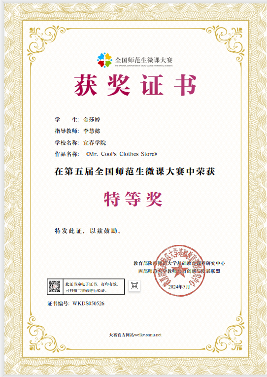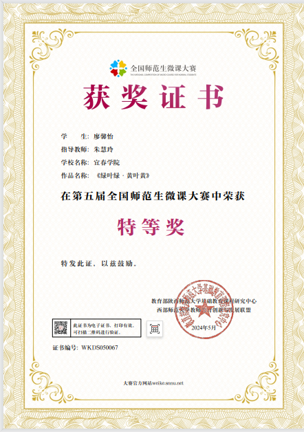 本站讯(特约通讯员 卢怡)近日,从全国师范生微课大赛官方平台传来喜讯,beat365参赛的20件微课作品在第五届全国师范生微课大赛中均获得奖项,其中外语学院金莎婷、刘磊憧,音舞学院廖馨怡,数计学院廖承宇等4位同学荣获特等奖,其余作品分别荣获一等奖2件,二等奖10件,优秀奖4件;beat365江莉莉、李慧懿、朱慧玲和冷春勇等教师获评微课大赛“优秀指导老师”。在师范教育学院精心组织下,beat365第五次荣获了该项赛事的“优秀组织院校”奖。