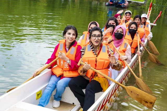 在天沐温泉度假村,一场精彩刺激的水上龙舟体验活动热闹举行。留学生们敲鼓、划桨,驾驶着龙舟在水面上疾驰,不仅让他们感受到了龙舟竞渡的激情与魅力,还增进了彼此之间的团结和友谊。留学生们还参加了一场别开生面的端午传统文化课程。课程中,专家详细介绍了端午节的起源、习俗,展示了中华传统文化的丰富内涵及背后的历史传承。参与活动的留学生们虽然文化背景各异,汉语水平不一,但都听得津津有味,也争相介绍着家乡的风土人情和特色美食。