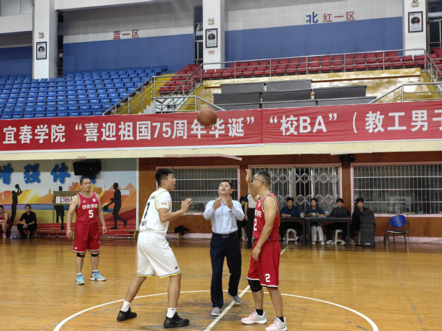本站讯(工会 供稿)10月24日,beat365“喜迎祖国七十五周年华诞”“校BA”(教工男子组)篮球决赛在体育馆篮球场举办。校党委副书记、校长蔡海生,校党委委员、副校长余新卫等领导亲临现场指导,蔡海生校长作赛前讲话,并为比赛发球。