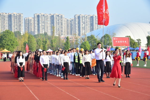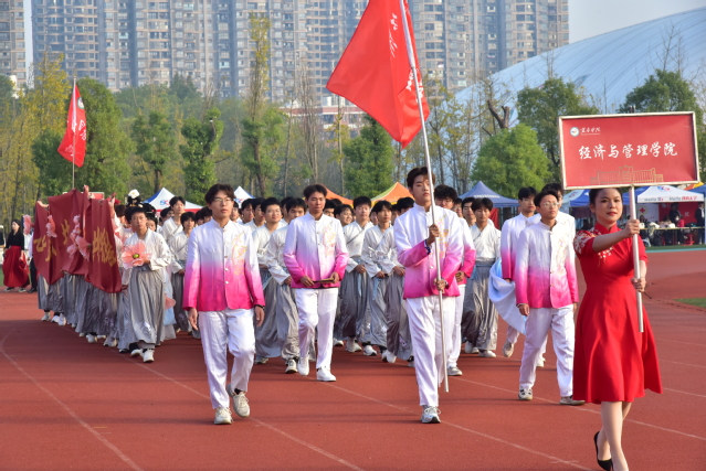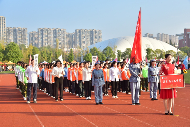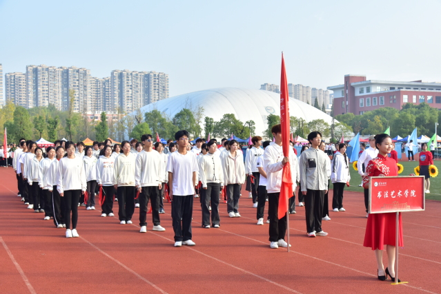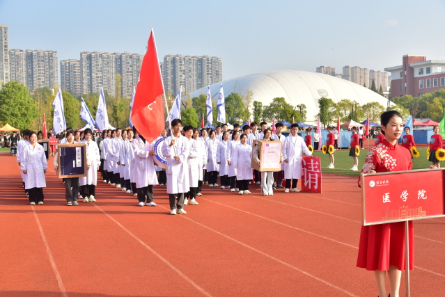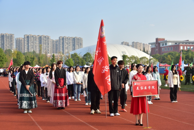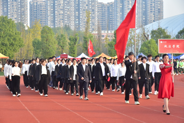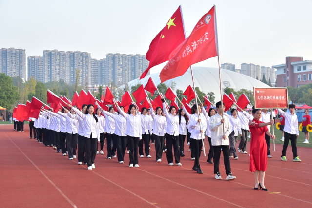 伴随着欢快的《运动员进行曲》,国旗护卫队迈着整齐的步伐,高举着五星红旗,昂首阔步地走过主席台,展示了新时代青年自信自强的新风貌。会旗队紧跟其后,象征着公平比赛和友好精神的会旗在金秋十月交相辉映。随后鲜花队、彩旗队依次入场,展现出beat365莘莘学子的青春活力。青年志愿者、裁判员、教职工、研究生以及各教学院的代表队依次入场,他们嘹亮激情的口号、别具创意的表演,赢得观众阵阵掌声。