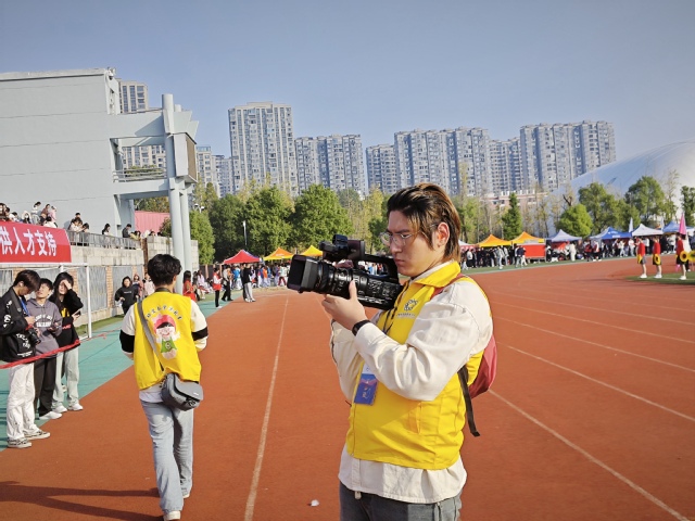 “你们尽情挥洒青春,我们用心记录。”摄影组成员冯祥辉这样描述拍摄工作,他认为校运会操场上的许多精彩瞬间都值得被“看见”,而融媒体中心正充当了这双发现美的眼睛。不论是活动快剪还是访谈影片,对摄影组成员来说早已是信手拈来,和团队成员一起穿上马甲、扛起设备、移动鼠标,生动的视频便跃然屏幕之上。为了让视频踩着时效性最好的时候发布,“赶进度”也是他们的家常便饭。在融媒体中心工作,“我们不仅仅是在培训中学习知识,更是在实践中体验和成长。这里是一个充满创造力和激情的地方,我们不仅是学生,更是创作者、策划者和执行者。”