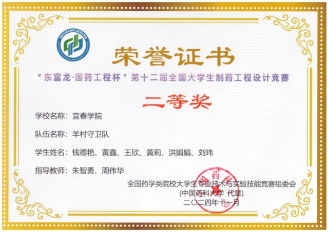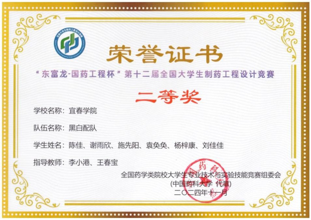 本站讯(特约通讯员 王春宝 陶华蕾)近期获悉,化学与生物工程学院学子在“东富龙-国药工程杯”第十二届全国大学生制药工程设计竞赛再创佳绩。此次大赛是由全国药学类院校大学生专业技术与实验技能竞赛组委会主办、东富龙科技集团股份有限公司与中国医药集团联合工程有限公司协办、重庆理工大学承办。该项赛事是目前我国高校制药工程专业层次最高、最有影响力的高水平专业赛事,是教育部高等学校药学类专业教学指导委员会指导推进制药工程专业发展的重要抓手。此次大赛共吸引180所高校参加,每所高校参与队伍数量不超过三支。