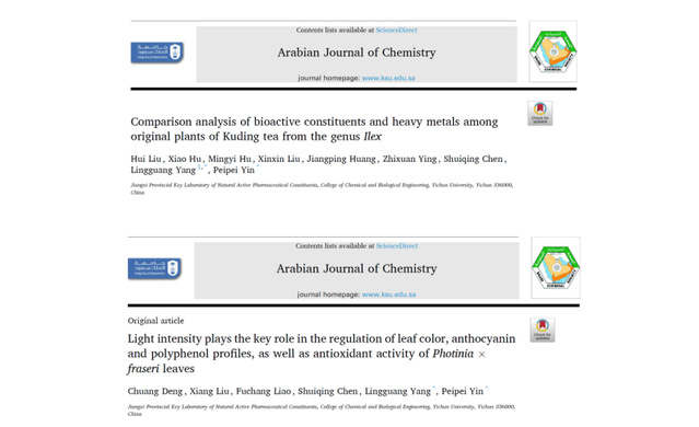 杨灵光与尹培培还在本年度9月及11月以共同通讯作者身份在化学经典期刊Arabian Journal of Chemistry(中科院二区;IF=5.3)连续发表学术论文两篇,针对冬青属苦丁茶来源植物中活性成分及重金属含量进行比较研究(DOI:10.1016/j.arabjc.2024.105914),并对重要观赏植物红叶石楠的叶色转变机制及其物质基础进行探究(DOI: 10.1016/j.arabjc.2024.106046)。其中题为《Comparison analysis of bioactive constituents and heavy metals among original plants of Kuding tea from the genus Ilex》的第一作者为22级药学研究生刘慧;题为《Light intensity plays the key role in the regulation of leaf color, anthocyanin and polyphenol profiles, as well as antioxidant activity of Photinia × fraseri leaves》的第一作者为该院21级本科生邓闯。