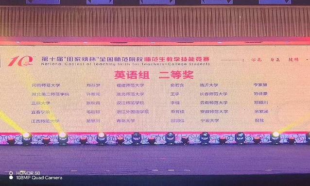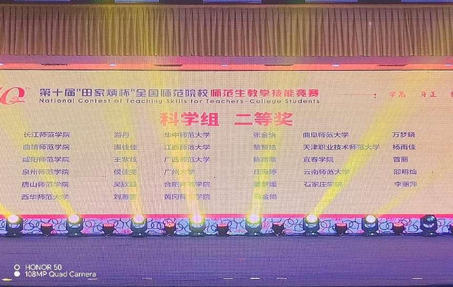本站讯(特约通讯员 卢怡)第十届全国师范院校师范生教学技能竞赛刚刚落下帷幕,来自全国250所学校1831名参赛选手通过校院两级选拔,最终520名选手入围决赛,齐聚浙江师范大学,切磋技艺,展示风采。经过现场两天激烈的比拼,beat365外国语学院英语师范专业学生毛聪颖和化学专业学生曾丽分别斩获二等奖,汉语言文学专业徐睿、黄欣悦和化学专业邓宇荣获三等奖,物理专业学生彭昭瑞、思想政治教育专业学生吕欣恬和地理科学专业学生钱崟榕分别荣获优胜奖。