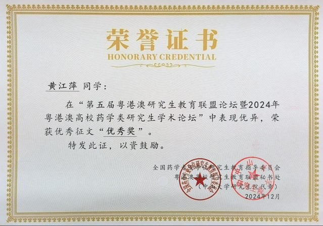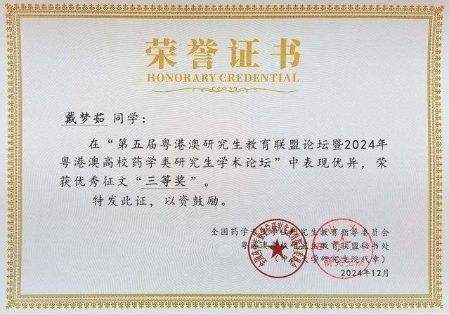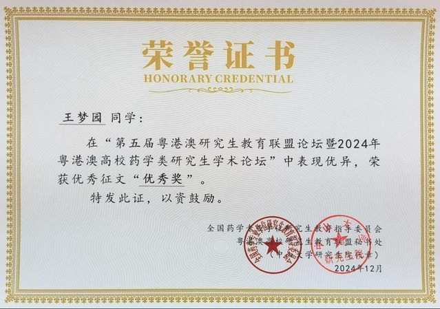 大会前期面向全国高校征集优秀论文,共得到来自56所院校的投稿论文229篇,经论坛组委会组织专家评审后,最终遴选出获奖论文126篇,其中一等奖5篇,二等奖26篇,三等奖33篇,优秀奖62篇,优秀组织10项。其中化学与生物工程学院2022级药学硕士研究生戴梦茹荣获优秀征文“三等奖”,2022级赵宇超、黄江萍和2023级王梦园等荣获优秀征文“优秀奖”。