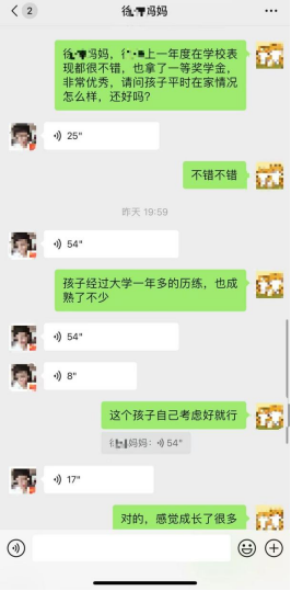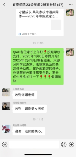 线上常联系,沟通零距离。寒假期间,辅导员、班主任通过微信、电话等方式,定期与学生家长进行沟通交流,及时了解学生动态,解答家长疑问,并针对不同学生的情况,提供个性化的指导和帮助,尤其是对重点关注学生做到联系关心全覆盖。许多家长在沟通中表达了对学校工作的认可与支持。