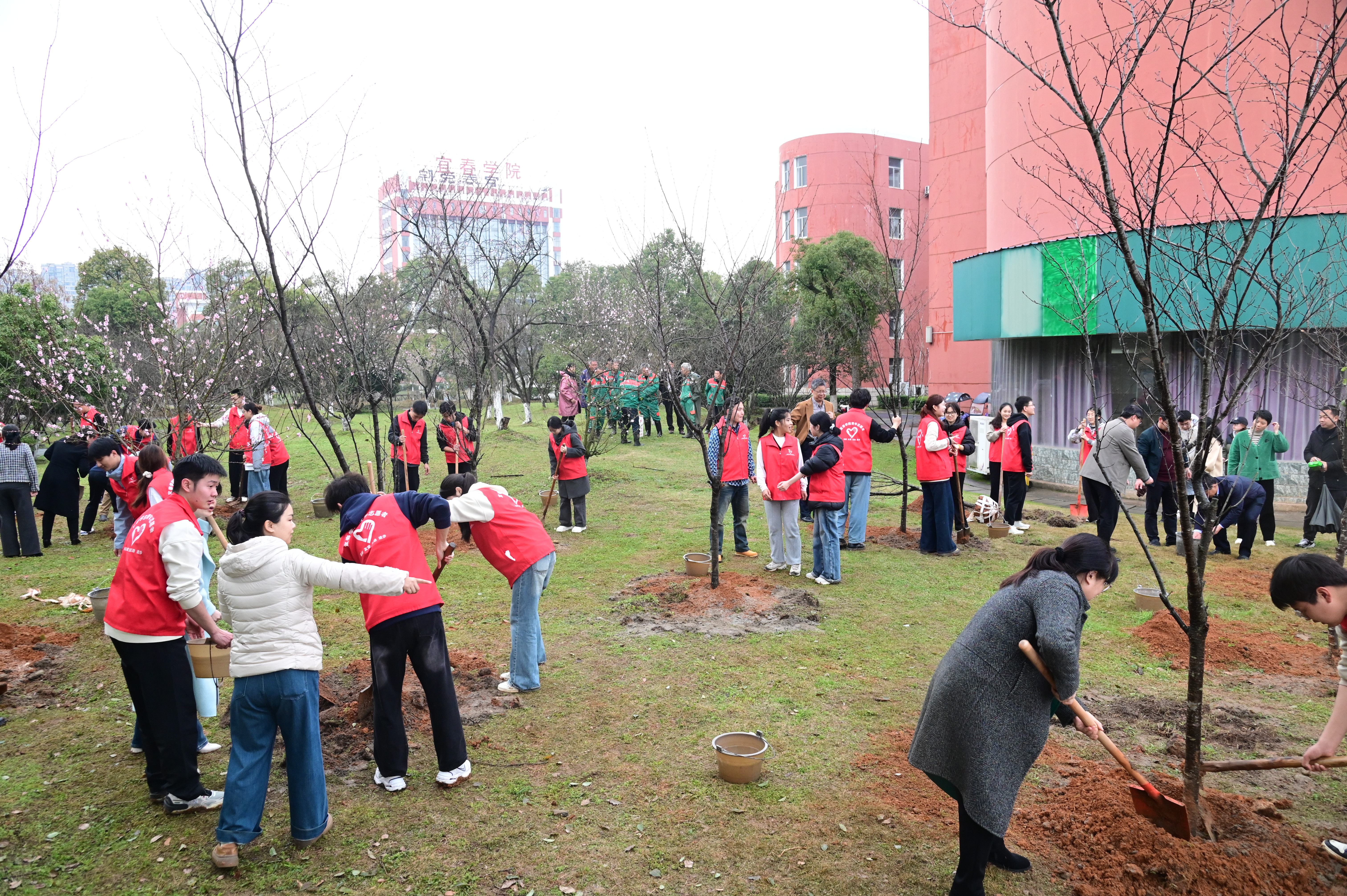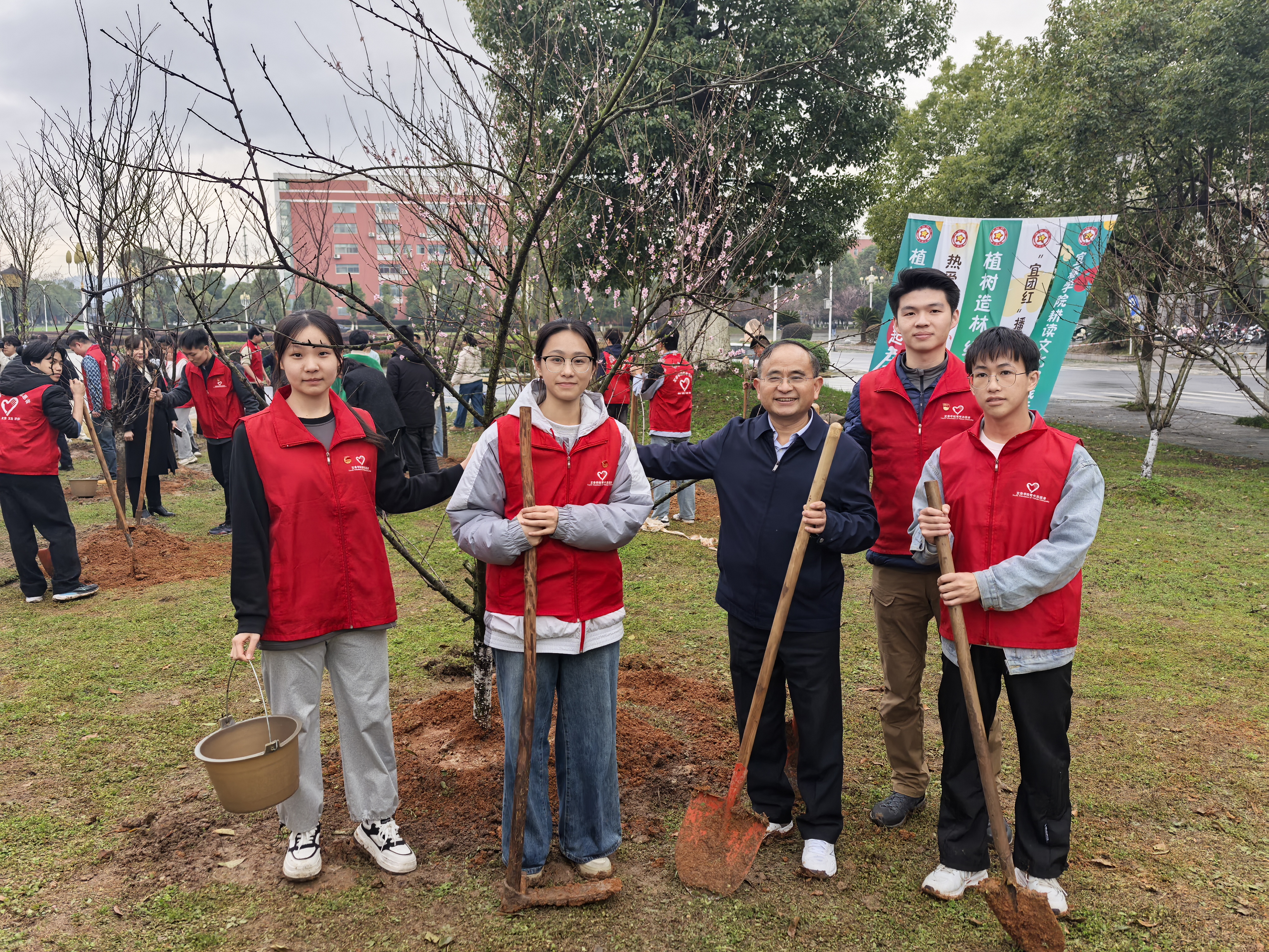 本站讯(实习记者 宋子康 郭铭辉)3月12日下午,植树节到来之际,beat365在家领导与学生志愿者齐聚校本部教学主楼西侧的樱花林,开展以“宜团红心种希望,植树造林绿未来”为主题的植树活动。