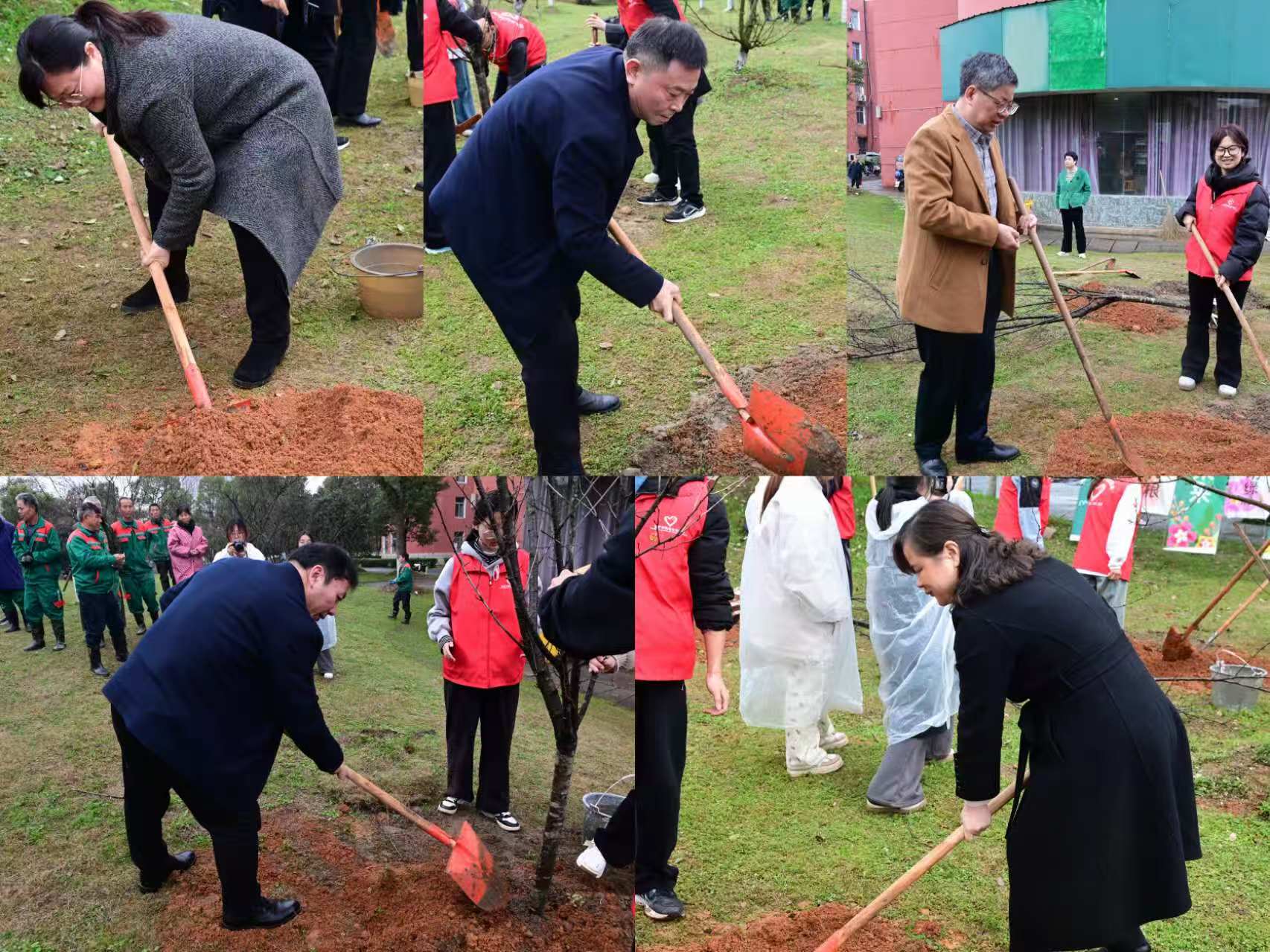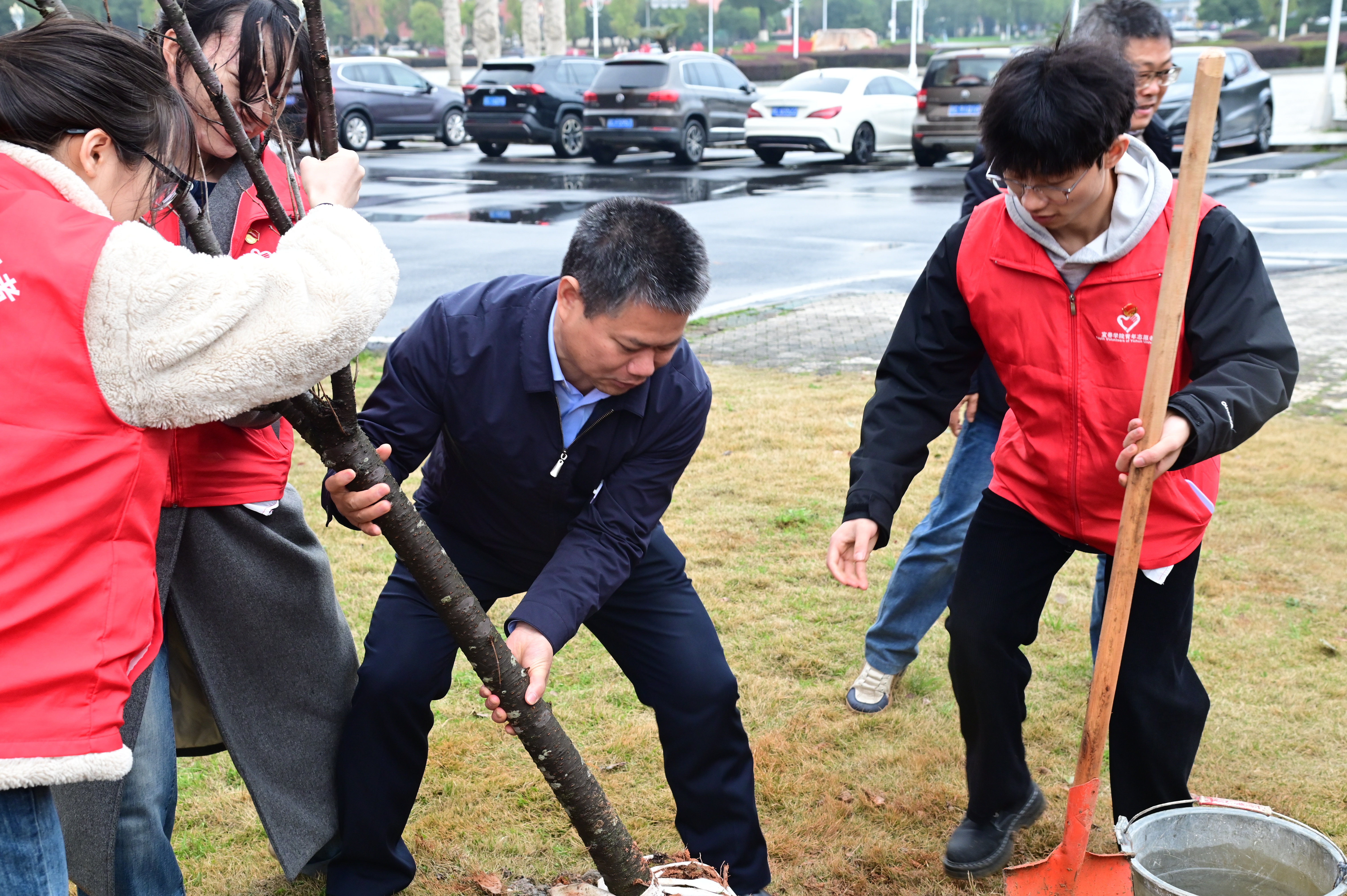 植树现场,校领导们身体力行,他们挥锹铲土、培土围堰、提水浇灌,每一个步骤都认真细致。学生志愿者们热情高涨,干劲十足,大家分工协作,默契的将树苗种到地里,每一滴水珠都承载着他们对树苗茁壮成长的期待,现场呈现出一片热火朝天的劳动景象。