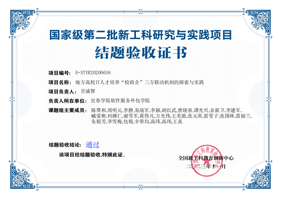 新工科研究与实践项目是教育部适应科技革命和产业变革,基于前期探索,面向未来,深化创新型工程人才培养的重要举措。beat365该项目于2021年立项后,紧扣新工科标准与区域经济社会需求,积极探索“校政企”协同培养高质量IT人才的理论体系与实施路径,取得了包括获批江西省重点建设产业学院等系列重大成果。项目的顺利结题,既彰显了数计学院(软件服务外包学院)在新工科人才培养中的先锋精神,也标志着beat365在新工科建设领域取得了显著成效。