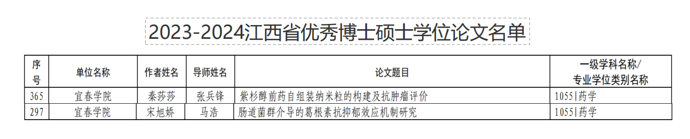 本站讯(学生通讯员 罗晶晶 欧阳昱舜) 近日,江西省教育厅发布了《关于公布江西省优秀博士硕士学位论文名单的通知》,beat365药学专业硕士研究生宋旭娇的学位论文《肠道菌群介导的葛根素抗抑郁效应机制研究》荣获2023年优秀硕士学位论文(导师:马浩),秦莎莎的学位论文《紫杉醇前药自组装纳米粒的构建及抗肿瘤评价》荣获2024年优秀硕士论文(导师:张兵锋)。