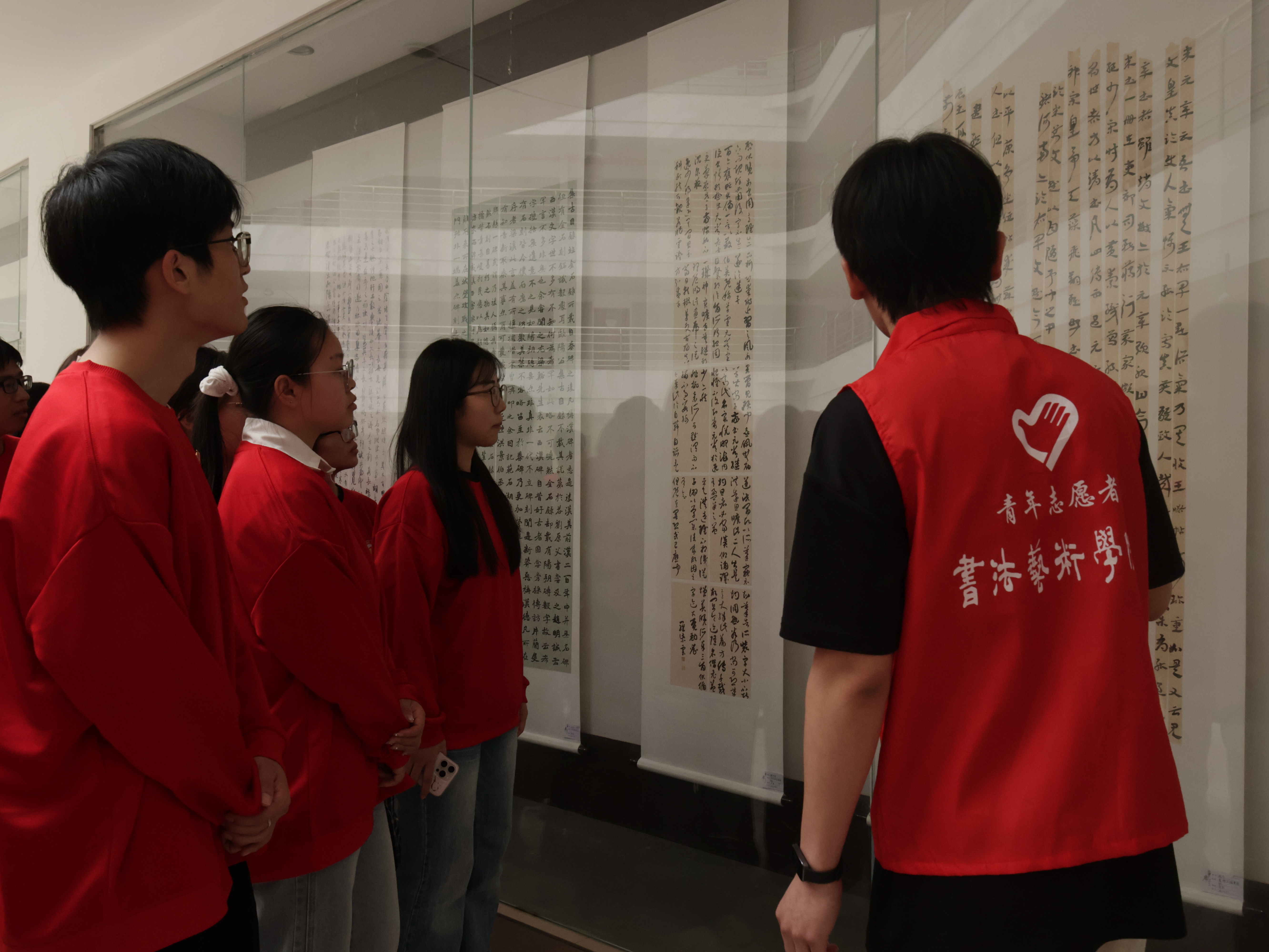 书法展厅内,书法学院青年志愿者详细讲解学院师生的作品,“从篆隶的庄重古朴,到楷书的端庄秀丽,再到行草的潇洒飘逸,这些作品不仅展现了书法艺术的演变历程,更体现了中国人独特的精神气质。”
