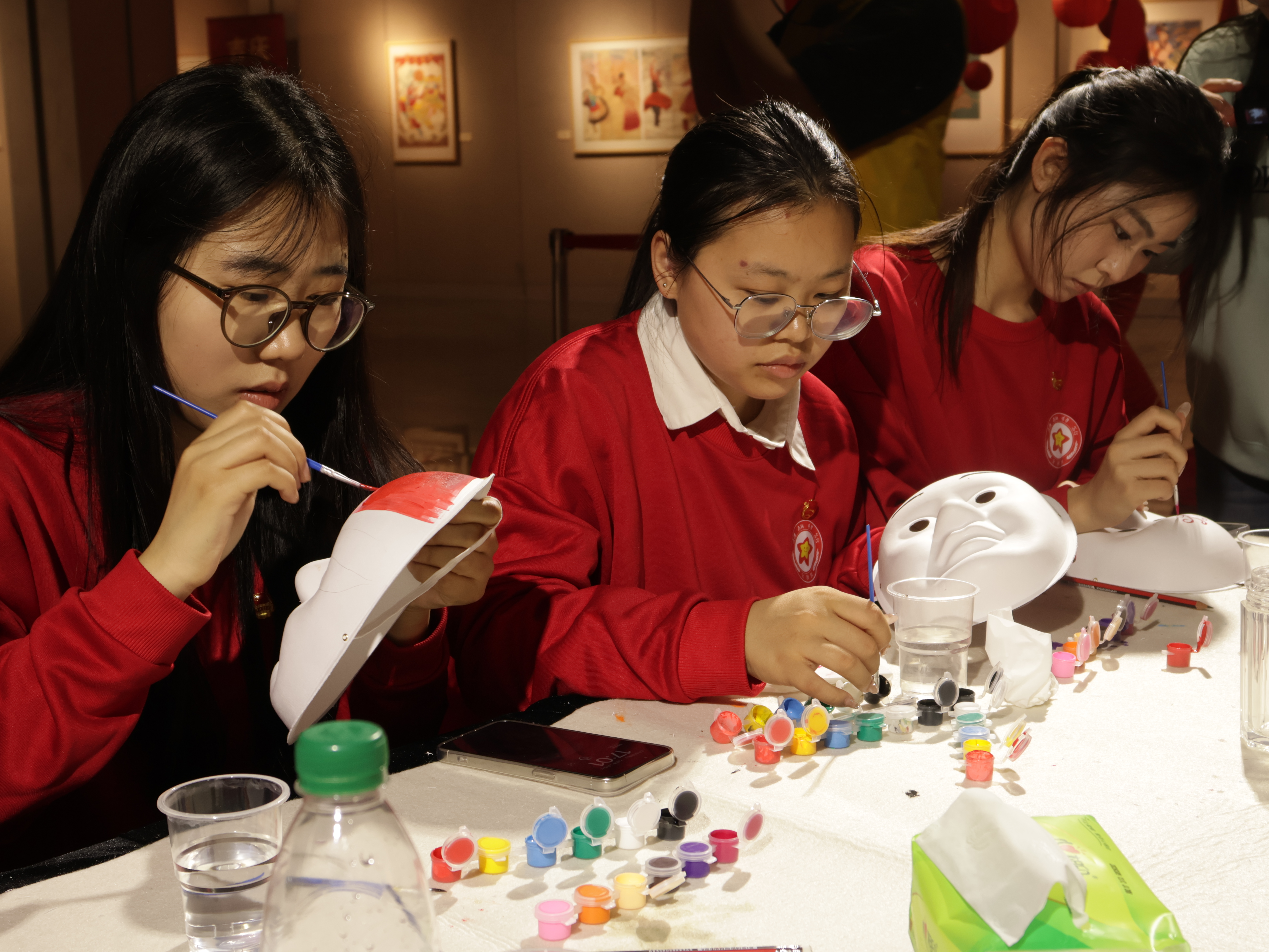 进入美术馆,仿若跌入民俗艺术的梦幻之境。在讲解员介绍下,师生们感叹着年画、年报的古韵。美术与设计学院李森老师现场演绎皮影戏,人偶在幕后翩然起舞,引得师生阵阵惊叹。脸谱绘制区师生们手持彩笔,在面具上精心勾勒,让传统神韵与青春创意碰撞出绚丽火花。