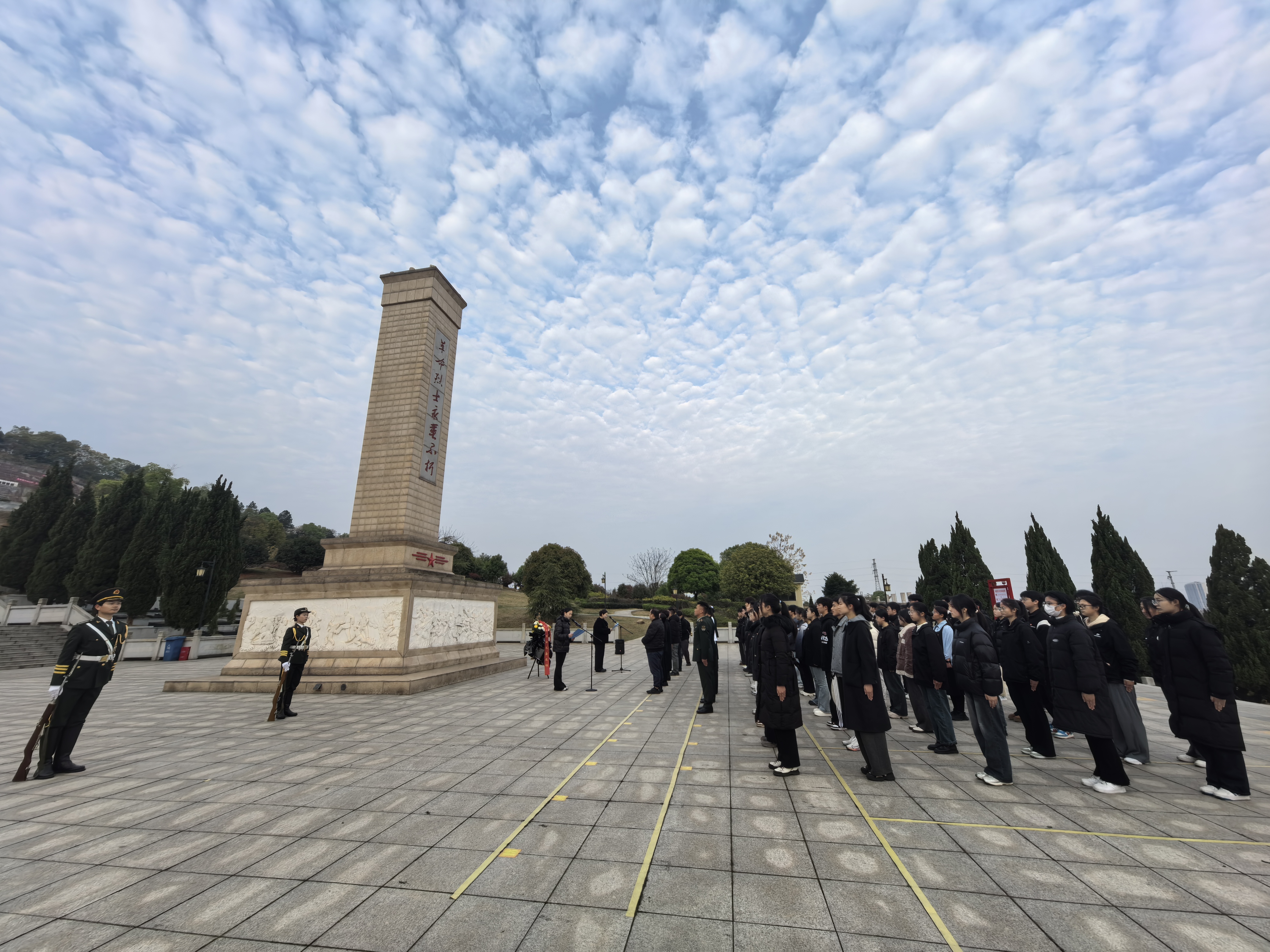 国旗护卫队迈着铿锵有力的步伐,向烈士纪念碑敬献花篮,全体师生脱帽肃立,默哀致敬,深切缅怀为民族独立、人民解放、国家富强和人民幸福英勇献身的革命先烈。
