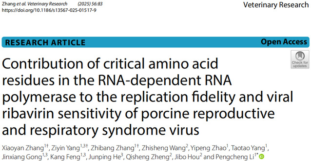 本站讯(生科学院 供稿)4月19日,生命科学与资源环境学院动物病原微生物实验室团队在国际顶级期刊《兽医研究(Veterinary Research)》(中国科学院兽医学1区)上发表题为“Contribution of critical amino acid residues in the RNA-dependent RNA polymerase to the replication fidelity and viral ribavirin sensitivity of porcine reproductive and respiratory syndrome virus”的研究论文。