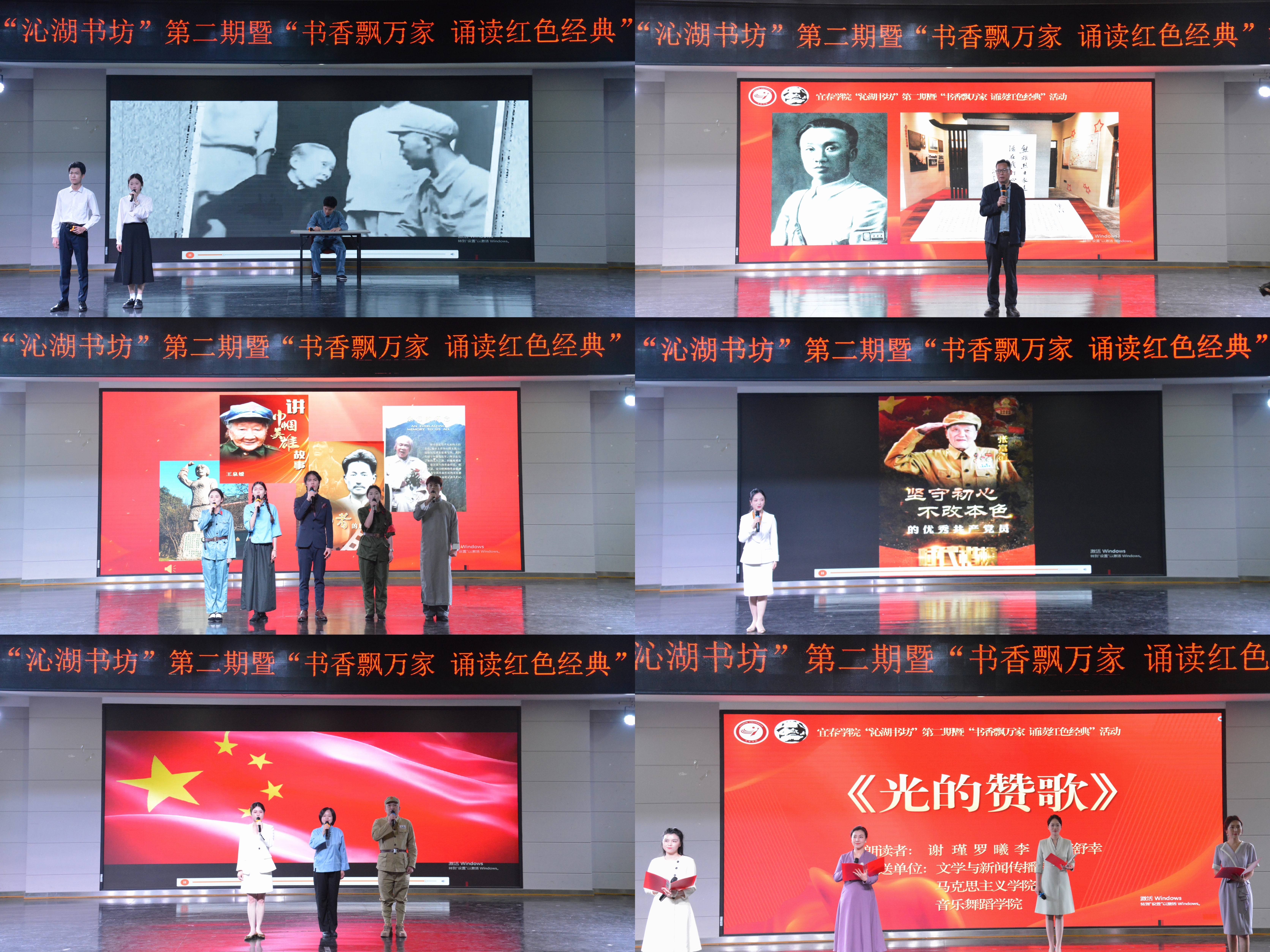 随后,来自文学与新闻传播学院、政法学院、马克思主义学院、音乐舞蹈学院和体育学院的师生们以饱满的热情演绎了《左权致母亲张氏》《巍巍照耀金展红旗》《锁在箱底的传家宝》《母子家书红色情怀》《光的礼赞》等经典作品片段。朗诵表演者们或慷慨激昂,或热泪盈眶,通过声音与文字的力量,带领全场师生回顾贺子珍、方志敏、左权、黄继光、张富清、王泉媛等革命先辈的奋斗史诗。此外,马克思主义学院的胡喜如老师现场分享了本籍革命家熊雄的光辉事迹,进一步挖掘了红色文化背后的深刻意义;马克思主义学院学生现场分享了他在这场诵读红色经典活动中的收获与体会,表达了红色精神在新一代青年人心中生根发芽的感悟。