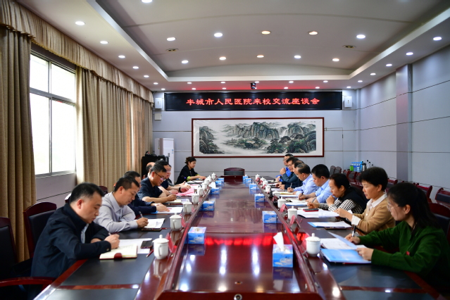 本站讯(记者 何杰)4月16日上午,丰城市人民医院院长谢静波一行来校交流,校党委书记李国金,校党委副书记、校长蔡海生,校党委委员、副校长李建军出席座谈会,丰城市人民医院、学校相关职能部门负责人参加座谈会。