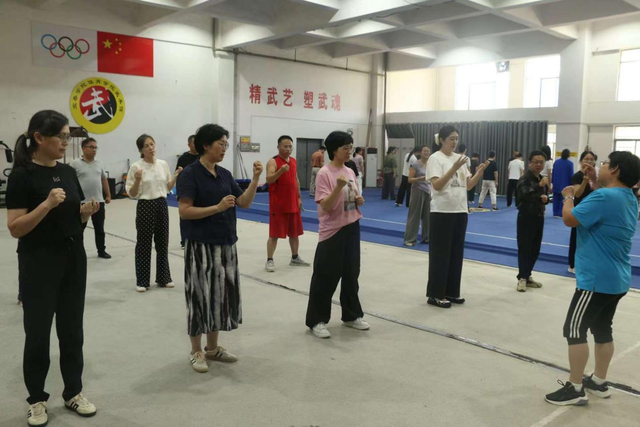 八段锦是我国从古流传至今的传统体育养生导引术,动作柔和连贯,兼具健身与养心效果,深受社会各界的欢迎。在体育学院老师的示范指导下,教职工们认真练习八段锦的各式、动作要领,一举一动尽显舒展与力量。