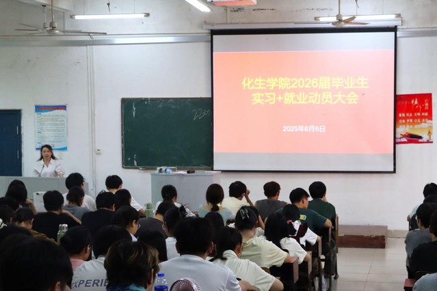 本站讯(化生学院 供稿)为进一步做好2026届毕业生实习与就业相关工作,6月6日下午,化学与生物工程学院于逸夫科技楼教室召开2026届毕业生实习就业动员大会。化学与生物工程学院党委副书记陶华蕾、教学与科研办公室负责人赖晓艺、专职辅导员甘淑芳及2026届全体毕业生参加。