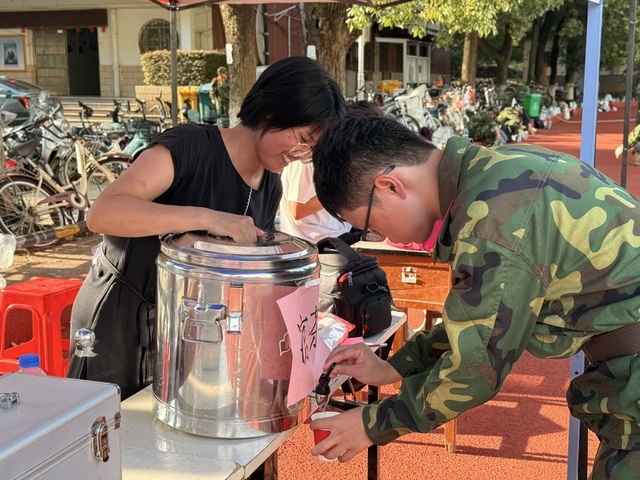 训练间隙,社员们将一杯杯温度适宜的凉茶递到新生手中,一声“同学,喝杯凉茶吧”,不仅舒缓了身体上的疲惫,更传递出校园特有的温情与关怀。