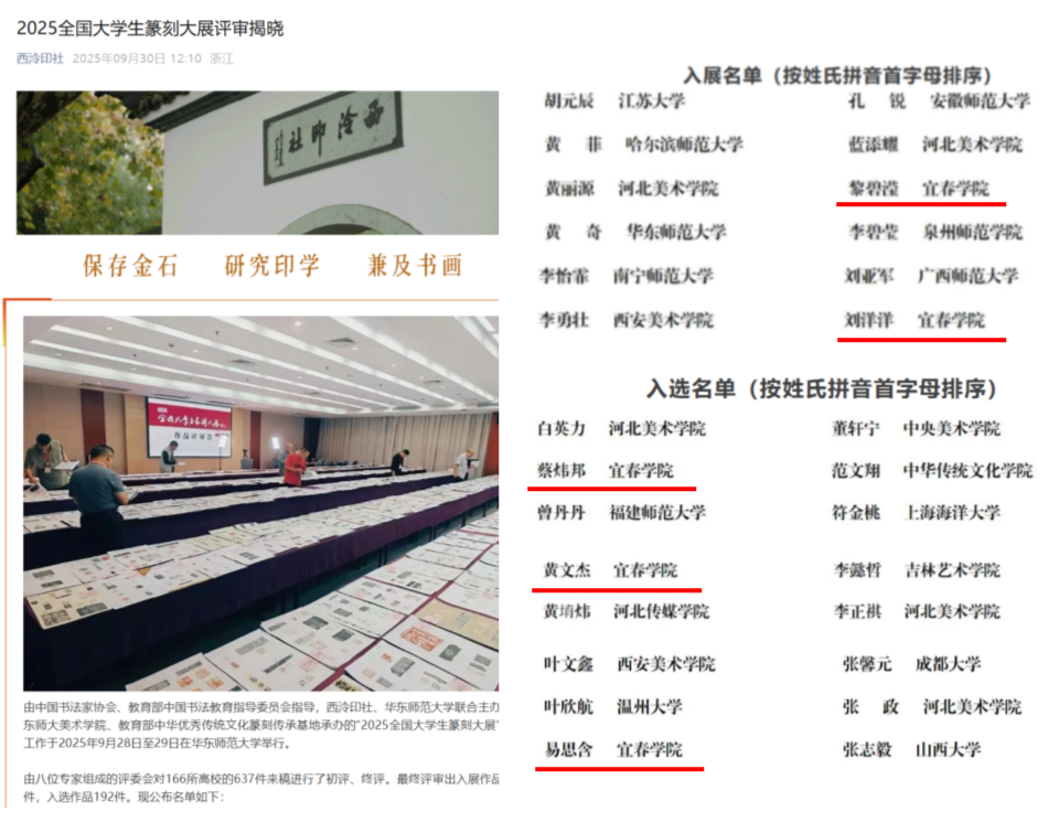 本站讯(美术与书法学院供稿)9月30日,2025全国大学生篆刻大展评审揭晓,美术与书法学院书法学专业本科生黎碧滢、刘洋洋2位同学篆刻作品入展(最高奖),蔡炜邦、黄文杰、易思含3位同学篆刻作品入选。
