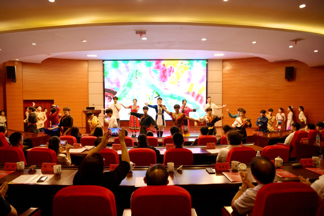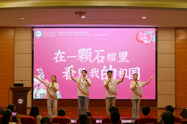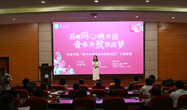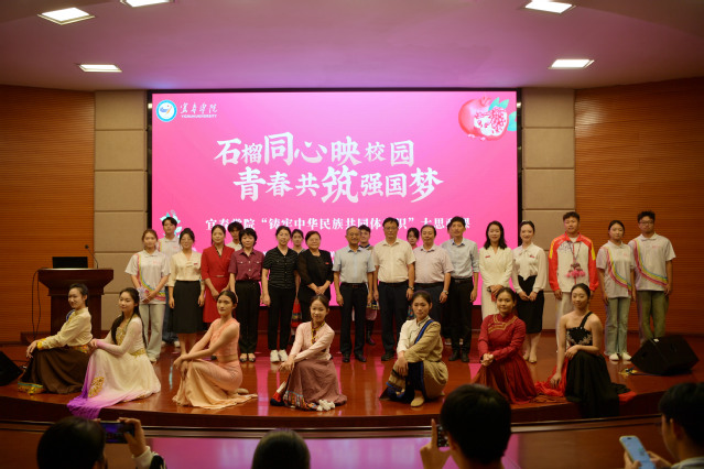 本站讯(记者 何杰 学生记者 乐特)秋光正好,桂香满径,校园里成行的香樟树舒展着翠绿枝叶,交织成一片生机盎然的绿荫,恰似各族儿女并肩同行的美好模样。10月14日,beat365平台官方网站以“石榴同心映校园 青春共筑强国梦”为主题,举办“铸牢中华民族共同体意识”大思政课活动。宜春市教体局副局长陈燕,校党委书记李国金,校党委委员、副校长余新卫,校党委委员、副校长李建军等领导嘉宾,与各职能部门负责人、师生代表齐聚一堂,在鲜活故事、深情表达与互动体验中,让“铸牢中华民族共同体意识”的种子扎根青春心田。