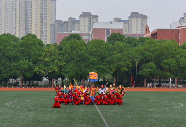 随后,精彩的文体表演轮番上演。首先,舞龙表演震撼开场,长龙腾空而起,龙身蜿蜒起伏,翻滚腾跃,充满着灵动与力量;万载傩舞沉淀着岁月的痕迹,古朴中透着雄浑,神秘里藏着对生活的热忱,尽显中华传统民俗文化的魅力。紧接着,组合舞蹈表演《掌扇风云》将武术与国标舞相融,兼具刚硬与柔美的舞姿引来现场阵阵喝彩。随后,八段锦缓缓展开,白衣学子凝神聚气,伸臂按掌流畅连贯,为赛场增添了一份宁静与和谐。